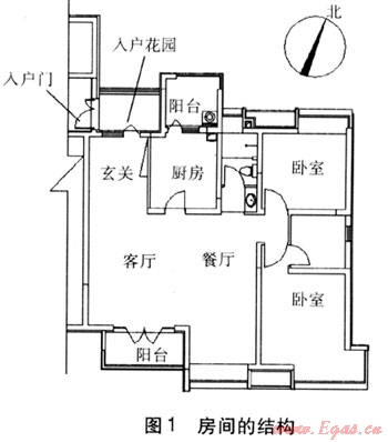 本文以某居住建筑為實(shí)例進(jìn)行分析計(jì)算,該建筑各層層高為2.9m,共13層,房間的結(jié)構(gòu)(另一側(cè)為對(duì)稱結(jié)構(gòu))見圖1。該居住建筑按照2007版的建筑節(jié)能標(biāo)準(zhǔn)設(shè)計(jì),其設(shè)計(jì)節(jié)能率為65%,合理使用年限為50年。建筑面積為5083.2m2,建筑體積為14741.28m3,建筑表面積為4189.98m2,窗墻比分別為:南向0.45,東向0.11,西向0.11,北向0.24。