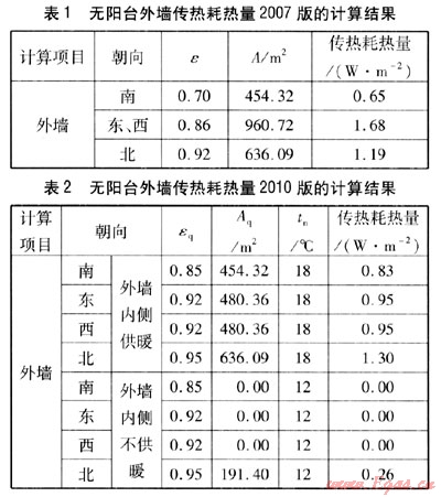 無陽臺(tái)外墻傳熱耗熱量,采用2007版的計(jì)算方法時(shí),由式(2)得到的計(jì)算結(jié)果見表1。采用2010版的計(jì)算方法時(shí),由式(4)得到的計(jì)算結(jié)果見表2。由表1、2可知:2010版的外墻傳熱系數(shù)修正系數(shù)大于2007版。2007版中內(nèi)側(cè)不供暖外墻不參與耗熱量計(jì)算,在內(nèi)側(cè)不供暖外墻耗熱量不參與比較時(shí),2010版計(jì)算得到的外墻傳熱耗熱量為4.03W/m2,仍大于2007版的計(jì)算結(jié)果(3.52W/m2)。由此可知,外墻傳熱系數(shù)修正系數(shù)和供暖室內(nèi)計(jì)算溫度的選取對(duì)于外墻傳熱耗熱量的影響比較大。
