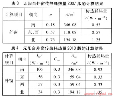 無陽臺(tái)外窗傳熱耗熱量,采用2007版的計(jì)算方法時(shí),由式(2)得到的計(jì)算結(jié)果見表3。采用2010版的計(jì)算方法時(shí),由式(5)、(6)得到的計(jì)算結(jié)果見表4。由表3、4可知,由2010版計(jì)算得到的計(jì)算結(jié)果大于2007版,說明2007版中無陽臺(tái)外窗傳熱耗熱量計(jì)算中采用一個(gè)綜合修正系數(shù)強(qiáng)化了太陽輻射得熱對(duì)外窗傳熱耗熱量的影響。