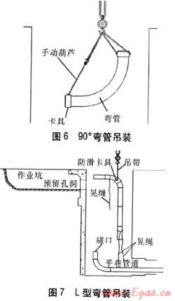 彎管在豎井預(yù)制管吊裝前先行吊裝。吊裝時(shí),為了保證下部焊口基本垂直,采用圖6所示的吊裝方式,通過調(diào)整手動(dòng)葫蘆的長度來控制彎頭狀態(tài)。