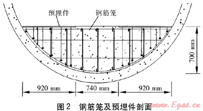 由隧道接收井處向始發(fā)井處進(jìn)行澆筑。當(dāng)混凝土運(yùn)輸車行駛到待澆筑位置時(shí),啟動(dòng)傳送帶上的電機(jī),打開料斗桶下方的活動(dòng)擋板,混凝土依靠自重下落到傳送帶上,輸送至待澆筑位置。混凝土澆筑時(shí),為保證施工的順利進(jìn)行,需在待澆筑混凝土的正上方設(shè)置鋼支架跳板,跳板需距離混凝土成型面有一定的距離,以保證混凝土正常成型。隧道內(nèi)的混凝土運(yùn)輸時(shí)間較長,利用混凝土運(yùn)輸?shù)臅r(shí)間進(jìn)行軌道拆除。軌道每段長6m,將拆除的軌道吊掛在隧道壁上。在澆筑混凝土過程中,將預(yù)制好的鋼筋籠和預(yù)埋件安裝好,保證預(yù)埋件上表面水平,且和墊層處于同一水平面,澆筑時(shí)要嚴(yán)格按照施工規(guī)范進(jìn)行振搗?;炷翝仓瓿?,在收漿后應(yīng)進(jìn)行養(yǎng)護(hù)。養(yǎng)護(hù)期間覆蓋保溫,并保持濕潤,覆蓋時(shí)注意不得損傷和污染混凝土表面。在混凝土上面漫鋪草袋,進(jìn)行灑水養(yǎng)護(hù)[2]。鋼筋籠及預(yù)埋件剖面見圖2。