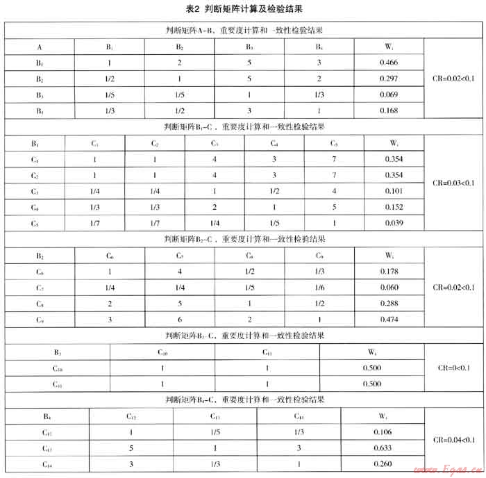 我們?cè)谡{(diào)研中反復(fù)向業(yè)內(nèi)專家咨詢,綜合各位專家意見(jiàn),并結(jié)合調(diào)研數(shù)據(jù),建立了判斷矩陣,并根據(jù)層次分析的一般方法(和積法),計(jì)算各要素的權(quán)重和進(jìn)行一致性檢驗(yàn)。限于篇幅,計(jì)算過(guò)程不詳細(xì)敘述,結(jié)果見(jiàn)表2。