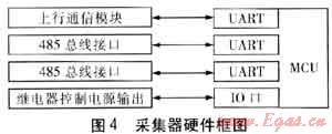 采集器的任務(wù)就是轉(zhuǎn)發(fā)集中器和燃?xì)獗碇g的通信數(shù)據(jù),并在抄讀燃?xì)獗淼臅r(shí)候短暫地給燃?xì)獗淼碾娮硬糠止╇姟2杉骱图衅髦g的通信采用了電力線載波通信方式。電力線載波通信有通信不穩(wěn)定、易受干擾的缺點(diǎn),但采集器只要在軟件上做些改進(jìn)就能極大地彌補(bǔ)這一缺點(diǎn),例如能短時(shí)間地儲(chǔ)存燃?xì)獗淼臄?shù)據(jù)。這樣當(dāng)給集中器返回的燃?xì)獗頂?shù)據(jù)因信道不穩(wěn)定而丟失時(shí),集中器再次下發(fā)抄這塊表的數(shù)據(jù)時(shí),采集器就不用再去抄燃?xì)獗砹?,而是很快地直接返回采集器?chǔ)存的數(shù)據(jù),這樣就使抄表成功率大大提高。采集器也要求采用可更換的通信模塊,儲(chǔ)存容量不需要太大,采集器MCU要有至少3個(gè)UART,還要有給燃?xì)獗砉╇妴卧2杉鞯挠布驁D見圖4。MCU的1個(gè)UART和上行通信模塊相連,2個(gè)UART設(shè)計(jì)成RS485總線。這2個(gè)RS485接口,1個(gè)是和燃?xì)獗硗ㄐ庞茫?個(gè)保留和集中器通信。如果采集器和集中器距離很近,就用保留的RS485接口直接和集中器相連。同時(shí)MCU控制1個(gè)繼電器給直讀式燃?xì)獗淼碾娮硬糠止╇姟?/span>