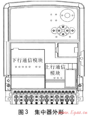 集中器外殼選用國(guó)家電網(wǎng)公司企業(yè)標(biāo)準(zhǔn)Q/GDW 375.2—2009《電力用戶用電信息采集系統(tǒng)型式規(guī)范:集中器型式規(guī)范》中的集中器外殼。外形見圖3??梢钥吹剑@個(gè)外殼上面有上行通信模塊和下行通信模塊兩個(gè)小盒子,這兩個(gè)小盒子采用了可插拔設(shè)計(jì)。左邊小盒子是和采集器通信的通信模塊,右邊小盒子是和主站通信的通信模塊。集中器在設(shè)計(jì)時(shí)先規(guī)定好集中器和這兩個(gè)通信模塊之間的通信協(xié)議和物理層的接口,所有通信模塊的設(shè)計(jì)都遵守這個(gè)協(xié)議。根據(jù)現(xiàn)場(chǎng)選擇通信方式的不同更換不同的通信模塊,這樣就大大提高產(chǎn)品的適應(yīng)能力。