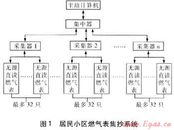 居民小區(qū)燃?xì)獗砑到y(tǒng)見圖1。系統(tǒng)由3部分組成,即燃?xì)獗怼⒓O(shè)備和主站。與傳統(tǒng)方式不同的是集抄設(shè)備不再是集中器一種設(shè)備,而是由集中器和采集器組成。集中器每天或每月輪抄1遍所轄的燃?xì)獗?,這個(gè)過程需要通過采集器轉(zhuǎn)發(fā)配合完成。集中器把數(shù)據(jù)保存在儲(chǔ)存器中然后等待主站發(fā)命令讀取。主站每天或每月定時(shí)讀取集中器內(nèi)的數(shù)據(jù),也可以通過集中器和采集器實(shí)時(shí)地讀取燃?xì)獗淼臄?shù)據(jù)。這個(gè)系統(tǒng)中燃?xì)獗磉x用無源直讀燃?xì)獗怼?/span>
