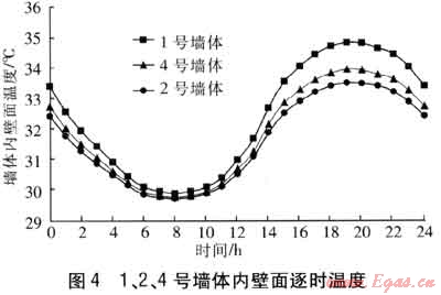 在同一溫度波的連續(xù)作用下,1、2、4號(hào)墻體內(nèi)壁面逐時(shí)溫度見圖4。由表3、圖4可知,1號(hào)墻體內(nèi)壁面平均溫度比2號(hào)墻體高約0.8℃,比4號(hào)墻體高約0.5℃。對(duì)比墻體傳熱系數(shù),1號(hào)墻體的傳熱系數(shù)明顯高于2、4號(hào)墻體。因此,墻體傳熱系數(shù)越大,內(nèi)壁面溫度越高。
