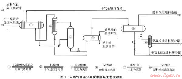 某含汞氣田天然氣處理廠采用節(jié)流制冷低溫分離脫水脫烴、注乙二醇防止水合物的處理工藝,主要工藝單元包括脫水脫烴單元、乙二醇再生單元及凝析油穩(wěn)定單元[7]。脫水脫烴單元的工藝流程如圖1所示,自集氣裝置來的原料天然氣,從上部進入原料氣預(yù)冷器(E-22101)。自乙二醇再生及注醇裝置來的乙二醇貧液通過霧化噴頭霧化,噴射入原料氣預(yù)冷器,和原料氣在管程中充分混合接觸后,與白干氣過濾分離器(F-22101)來的冷干氣進行換熱,被冷卻至-5℃左右。原料天然氣再經(jīng)J-T閥作等焓膨脹,氣壓降至6.4MPa,溫度降至-30℃左右,再從中部進入低溫分離器(D-22101)進行分離,分離出液態(tài)含醇液和凝析油。干氣進入干氣過濾分離器(F-22101)進一步分離出夾帶的少量的含醇液和凝析油,再進入E-22101殼程與原料天然氣逆流換熱,換熱后的干氣輸送至增壓站。