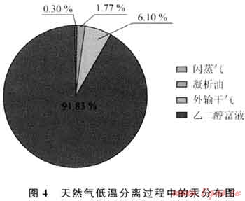 為了定量分析含汞天然氣低溫分離過程中汞的分布規(guī)律,以原料氣汞含量為100μg/m3為例,利用VMGSim軟件對天然氣脫水脫烴工藝流程進行模擬,其關(guān)鍵物流點的汞濃度見表2。根據(jù)模擬結(jié)果,可計算出標準狀態(tài)下(20℃,101.325kPa)閃蒸氣、未穩(wěn)定凝析油、乙二醇富液和外輸干氣中的汞濃度分別為1960.43μg/m3、80.77μg/L、4.69mg/L和6.11μg/m3。原料氣中的汞在各物流中的分布情況如圖4所示。由圖4可知,含汞天然氣經(jīng)過低溫分離后,原料氣中91.83%(質(zhì)量分數(shù))的汞進入了乙二醇富液中,6.10%(質(zhì)量分數(shù))的汞進入了外輸干氣中,1.77%(質(zhì)量分數(shù))的汞進入了未穩(wěn)定的凝析油中,剩余0.30%(質(zhì)量分數(shù))的汞進入了三相分離器閃蒸氣中。