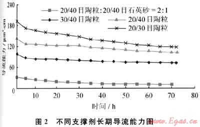 30/40目、20/40目和20/30目3種不同規(guī)格陶粒72h后導(dǎo)流能力分別為73.16μm2·cm、102.5μm2·cm和118.3μm2·cm,粒徑較大,導(dǎo)流能力較好??梢钥闯?,隨著時(shí)間的推移,粒徑增大,導(dǎo)流能力下降速度較快,但其末期導(dǎo)流能力仍高于較小粒徑支撐劑。