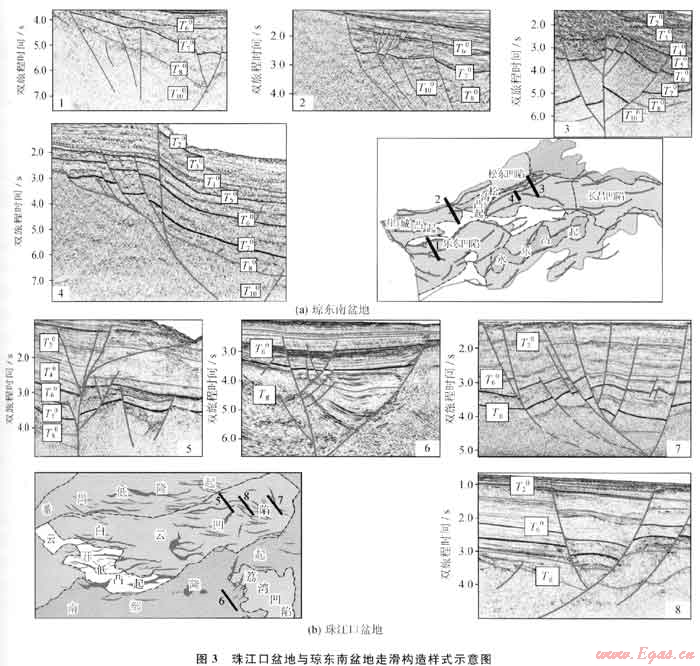 2) 受盆地動(dòng)力學(xué)機(jī)制影響,盆地構(gòu)造樣式可以劃分為伸展構(gòu)造樣式、走滑構(gòu)造樣式及重力構(gòu)造樣式。每一種構(gòu)造樣式均反映了不同的動(dòng)力學(xué)背景。其中伸展構(gòu)造樣式在盆地內(nèi)占主要地位,走滑構(gòu)造樣式及重力構(gòu)造樣式主要分布于盆地局部。