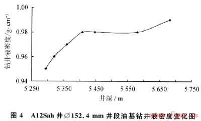 根據(jù)各井儲(chǔ)層孔隙壓力情況及安全鉆井密度窗口,選擇密度合適的VERSACLEAN油基鉆井液。以A12Sah井為例,該井儲(chǔ)層段采用密度為0.95g/cm3高油水比油基鉆井液開鉆,隨著現(xiàn)場鉆井過程中屏蔽暫堵材料的不斷補(bǔ)充及鉆屑固相含量的增加,至該井段完鉆時(shí)鉆井液密度為0.99g/cm3(圖4)。