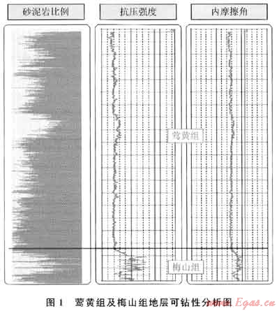 Φ311.15mm井段面臨著井段長、作業(yè)時(shí)間長、地層跨度大、下部層位石灰質(zhì)含量高、二次造斜等諸多挑戰(zhàn),鉆頭選型是否合理,關(guān)系到整口井的時(shí)效高低。本井段穿越鶯黃組下部、梅山組、三亞組(部分井缺失)地層,鶯黃組下部地層較為均質(zhì),地層抗壓強(qiáng)度介于34.5~55.2MPa,內(nèi)摩擦角在35°以下,具有較好的可鉆性;梅山組地層埋深大,地層抗壓強(qiáng)度介于55.2~103.4MPa,部分層位石灰質(zhì)含量高,內(nèi)摩擦角介于36°~40°,對(duì)鉆頭的抗沖擊性及抗研磨性具有較高的要求(圖1)。
