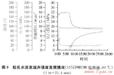 據(jù)本文參考文獻(xiàn)[5]報(bào)道,鹽摻量大于10%時(shí)以上時(shí)會(huì)造成水泥石早期強(qiáng)度損失,其強(qiáng)度明顯下降。因此,必須考慮含鹽膠乳水泥漿的強(qiáng)度發(fā)展情況。耐鹽膠乳水泥漿在90℃下的超聲強(qiáng)度發(fā)展眙線如圖5所示。從圖5可以看出,膠乳水泥石24h抗壓強(qiáng)度大于14MPa。