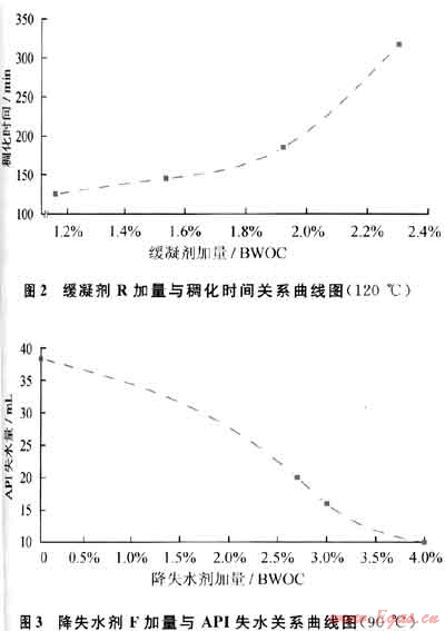 由于作為抗衡離子的Na+會(huì)擴(kuò)散到陰離子聚電解質(zhì)分子鏈周圍,屏蔽聚電解質(zhì)自身所帶負(fù)電荷,降低聚合物分子鏈間斥力,導(dǎo)致聚合物分子鏈蜷縮,從而使得普通型外加劑性能變差,因此,必須開發(fā)耐鹽型外加劑。本研究成功開發(fā)了耐鹽型的緩凝劑R和降失水劑F。通過調(diào)整緩凝劑R的加量,水泥漿稠化時(shí)間可調(diào),緩凝劑加量在120℃下對(duì)稠化時(shí)間的影響如圖2所示。水泥漿的API失水隨F加量變化如圖3所示,水泥漿的失水在試驗(yàn)條件下能控制在50mL以內(nèi)。