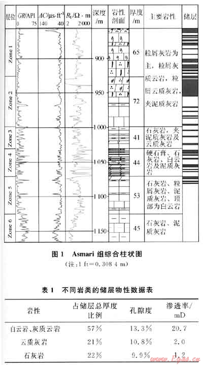 根據(jù)測井解釋(表1),白云巖類儲層所占比例高,孔隙度、滲透率高,物性好,是主要的儲集巖類,這與MIS構造Asmari組主要為石灰?guī)r儲層的傳統(tǒng)認識有差別[1]。