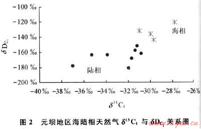 根據(jù)前人對甲烷氫同位素的研究,通常認為烷烴氣的氫同位素首先制約于沉積環(huán)境,其次才是成熟度的影響。Schoell提出天然氣氫同位素組成隨烴源巖熱演化程度的增加變重,陸相淡水環(huán)境生成的熱成因甲烷的氫同位素組成小于-190‰,海相環(huán)境生成的甲烷的氫同位素組成大于-190‰[1]。沈平等研究發(fā)現(xiàn)中國陸相盆地天然氣甲烷的氫同位素組成介于-255‰~-158‰,其中海陸交互相的半咸水環(huán)境中生成的甲烷氫同位素值(δD)亦大于-190‰,而湖相、沼澤相的淡、微咸水環(huán)境生成的生物甲烷δD值一般小于-200‰[2~5]。王曉峰等對塔里木盆地海相和陸相環(huán)境生成的天然氣甲烷氫同位素進行研究后發(fā)現(xiàn),二者基本以-170‰為界[3~6]。錢志浩等認為,四川盆地天然氣由于成熟度和共存水的影響,海陸相天然氣甲烷8D的劃分界限以-160‰為宜[6]。