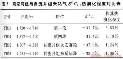 總體上,自流井組珍珠沖段、東岳廟段及大安寨段天然氣組分特征與須家河組相比較具有干燥系數(shù)低、重烴含量高的特點,且自流井組天然氣甲烷碳同位素值比須家河組更輕,由化驗分析結果結合地質(zhì)特征,自流井組天然氣熱演化程度比須家河組要低(表3)。例如,YB03井東岳廟段(4035~4110m)天然氣組成中甲烷含量為91.79%,重烴含量為6.257%,干燥系數(shù)C1/C1-5=0.936,屬于偏干的濕氣,相當于高成熟階段天然氣。天然氣甲、乙、丙烷系列碳同位素值依次變重,且甲烷碳同位素值相對較輕,反映原地生成而且具有全捕獲的特征,也即聚集了低演化至目前高成熟階段的全系列天然氣,具有典型原地成藏的天然氣地球化學特征(表1、2)。