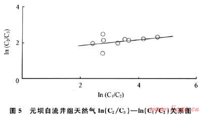 自流井組天然氣ln(C2/C3)值變化很小(處于數(shù)值2附近),在ln(C2/C3)—ln(C1/C2)關系圖上基本呈一水平直線;而ln(C1/C2)值變化較大(介于2~5)。由此,可以判斷元壩地區(qū)自流井組天然氣主要屬于干酪根裂解氣類型(圖5)??紤]到元壩地區(qū)自流井組天然氣相對較濕、重烴含量較高的特點及地質(zhì)特征,綜合研究認為該區(qū)可能存在少量的原油二次裂解氣。