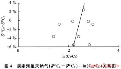 如圖3所示,須家河組天然氣組分ln(C1/C2)變化比較大,變化區(qū)間在4~6,數(shù)據(jù)點具有橫向散開分布的特點,而ln(C1/C2)變化比較小,基本維持在數(shù)值2附近,分布相對集中。因此,根據(jù)判識標準,該區(qū)須家河組天然氣氣源類型應屬于干酪根裂解氣的范疇。