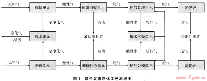 高含硫原料氣經(jīng)過脫硫單元脫除幾乎所有的H2S、部分有機(jī)硫及C02,再經(jīng)過脫水單元脫水后,合格凈化氣出裝置外輸。脫硫單元產(chǎn)生的含有H2S的酸性氣體進(jìn)入硫磺回收單元,將硫元素回收為液硫,送出裝置,經(jīng)成型后運(yùn)至硫磺儲(chǔ)運(yùn)系統(tǒng)并外銷。硫磺回收單元的尾氣經(jīng)過尾氣處理單元凈化處理,凈化后的尾氣送至尾氣焚燒爐焚燒后,產(chǎn)生的煙氣能滿足國(guó)家環(huán)保要求,經(jīng)煙囪排入大氣;產(chǎn)生的酸性水送至酸性水汽提單元,汽提出的。酸性氣體送至尾氣處理單元凈化處理,而處理后合格的凈化水則送至循環(huán)水廠循環(huán)使用。