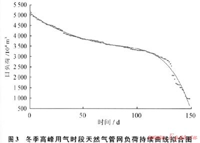 由圖2可知同一地區(qū)的天然氣管網(wǎng)負(fù)荷持續(xù)曲線具有相似性,為了研究極端天氣條件下的天然氣管網(wǎng)負(fù)荷特性,現(xiàn)取北京市2009年4月1日至2010年3月31日的天然氣管網(wǎng)負(fù)荷持續(xù)曲線,將夏季負(fù)荷截去后,留下冬季高峰用氣時段150d的負(fù)荷曲線,如圖3所示。對圖3中散點進(jìn)行數(shù)值擬合得到擬合多項式[6]: