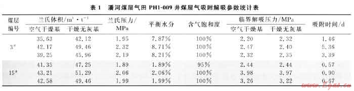 PH1-009井等溫吸附實驗溫度采用儲層溫度,平衡水分條件,測試結(jié)果表明,區(qū)內(nèi)3#、15#煤層對甲烷具有很強的吸附能力。如表1所示,3#煤層蘭氏體積介于35.63~42.17m3/t,平均為39.02m3/t,蘭氏壓力介于1.95~2.32MPa;15#煤層蘭氏體積介于41.35~43.21m3/t,蘭氏壓力介于1.89~2.06MPa。15#煤層吸附能力高于3#煤層。吸附時間,3#煤層為3.39d,15#煤層為0.67d。煤層含氣飽和度均很高,除15#煤層的一個樣品為95%外,其余都是100%。