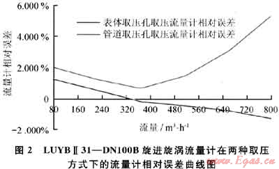 由表1、2得到LUYBⅡ31—DN1008旋進(jìn)旋渦流量計(jì)在兩種取壓方式下的流量計(jì)相對(duì)誤差曲線如圖2所示。