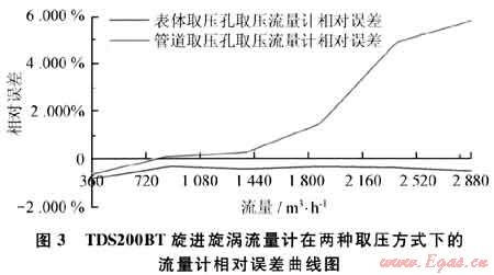 以某公司生產(chǎn)的TDS200BT旋進(jìn)旋渦流量計(jì)為例,系統(tǒng)運(yùn)行時(shí)間為60s,標(biāo)準(zhǔn)裝置的滯止平均溫度為29.7℃,空間平均濕度為42%,流量計(jì)的平均溫度為29.3℃,在表體取壓孔取壓和管道取壓孔取壓的流量計(jì)檢定試驗(yàn)數(shù)據(jù)分別如表3、4所示。兩種取壓方式下的流量計(jì)相對(duì)誤差曲線如圖3所示。