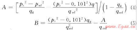 把氣井測試一點(diǎn)獲得的qg、pwf、pr數(shù)據(jù)代入式(7)求B值,再用一般二項(xiàng)式求A值,由此即可求得測試井的二項(xiàng)式和qaof。
