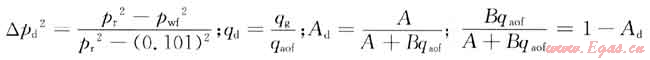 由一般二項(xiàng)式pr2-pwf2=Aqg+Bqg2和qaof表達(dá)式pr2-0.1012=Aqaof+Bqaof2推導(dǎo)出對(duì)比參數(shù)二項(xiàng)式,即△pd2=Aqd+(1-Ad)qd2,一點(diǎn)法二項(xiàng)式絕對(duì)無阻流量表達(dá)式為: