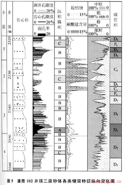 須二段大型復(fù)合砂體主要由4期河道遷移擺動(dòng)形成的砂體組成,縱向上不同時(shí)期沉積砂體之間或同期砂體內(nèi)部的沉積韻律、微相組合、膠結(jié)物類型及其含量、成巖相類型及其組合以及孔隙度和面孔率等存在明顯差異,非均質(zhì)性較強(qiáng)。圖5為潼南102井須二段復(fù)合砂體沉積微相、成巖相和孔隙度的縱向變化圖,可見河道滯留微相(A)和砂壩相砂體(B)主要由粗?;蛑辛I敖M成,發(fā)育強(qiáng)溶蝕成巖相(D1)和中溶蝕成巖相(D2和D3),對(duì)應(yīng)的巖心孔隙度可超過7%,而溢流砂坪相砂層(C)及其上下地層由細(xì)粒粉砂和泥巖組成,常見機(jī)械壓實(shí)致密成巖相(Pc)和碳酸鹽充填成巖相(Cc),對(duì)應(yīng)孔隙度在2%~5%,以上現(xiàn)象說明沉積微相、成巖相和儲(chǔ)層物性三者之間的關(guān)系密切,儲(chǔ)層物性明顯受沉積微相和成巖相雙重控制,其中河道粗粒砂巖原生孔隙發(fā)育,有利于各類溶蝕作用的產(chǎn)生,形成中低孔滲儲(chǔ)集體,造成儲(chǔ)層非均質(zhì)性強(qiáng)。