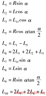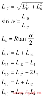 把已知條件代入計算公式,可以求得唯一的管道轉(zhuǎn)角α、兩個轉(zhuǎn)角之間直線段的長度L16、兩個轉(zhuǎn)角端頭的直管段長度L13、L15。