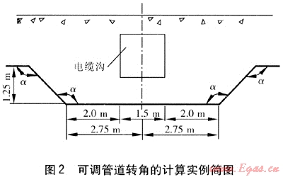 下面舉一個工程實例。在燃?xì)夤艿赖目v斷圖設(shè)計中遇到一處電纜溝,采用可調(diào)管道轉(zhuǎn)角的計算方法進(jìn)行計算,可調(diào)管道轉(zhuǎn)角的計算實例簡圖見圖2。