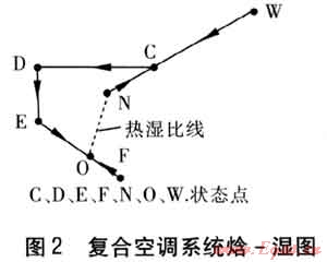 一次回風空調系統(tǒng)焓一濕圖見3。狀態(tài)W的室外新風與狀態(tài)N的室內回風混合處理到狀態(tài)C,經(jīng)過表冷器冷卻除濕到狀態(tài)L(機器露點),然后經(jīng)過電加熱器加熱到送風狀態(tài)0送入房間,吸收房間余熱余濕,沿熱濕比線到狀態(tài)N。一次回風空調系統(tǒng)的主要缺點是:被處理空氣先冷卻后再熱,存在冷熱抵消問題;表冷器在濕工況下工作,需要溫度較低的冷源。