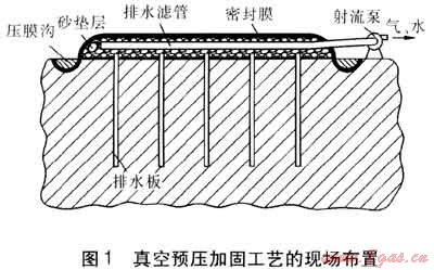 在采用真空預(yù)壓加固軟土地基時(shí),在密封膜上不施加重物,而把大氣作為荷載。在抽氣時(shí),土體孔隙中的氣體首先被抽出,使密封膜緊貼于砂墊層上。砂墊層中形成的負(fù)壓,通過排水板逐漸向下延伸,并由排水板向其周圍土體傳遞,引起土體中孔隙水壓力降低,從而使土體孔隙中的水由土體向排水板滲流,最后匯至砂墊層中被射流泵排出。淺層真空預(yù)壓加固與深層真空預(yù)壓加固工藝的主要區(qū)別在于,前者采用編織布、無紡?fù)凉げ嫉忍娲皦|層,以及排水濾管的布置方式不同。真空預(yù)壓加固工藝的現(xiàn)場(chǎng)布置見圖1。