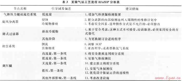 采用HAZOP法對某輸氣站的工藝流程進(jìn)行了全面的危險辨識,將該站的工藝流程劃分為8個分析節(jié)點(diǎn),共考慮了78個偏差,形成了13條建議(表3)、24項(xiàng)跟蹤任務(wù)[6]。