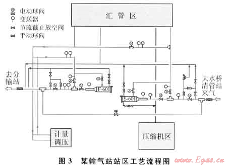 某輸氣站海拔3000m,占地面積逾3×104m2。此前該站僅為清管站,2007年增壓站投產(chǎn)運(yùn)行。站區(qū)分為綜合值班區(qū)、工藝裝置區(qū)、壓縮機(jī)組區(qū)和場外放空區(qū)。全站實(shí)現(xiàn)了場站自動化控制,采用SCADA系統(tǒng)對工藝參數(shù)進(jìn)行采集和監(jiān)控。該站具備天然氣增壓、除塵過濾、數(shù)據(jù)采集和上傳、收發(fā)清管器、天然氣放空與泄壓、發(fā)電、供暖等功能,是一個標(biāo)準(zhǔn)化的壓縮機(jī)站場。站內(nèi)管線設(shè)計(jì)壓力6.3MPa。圖3為某輸氣站站區(qū)工藝流程圖。