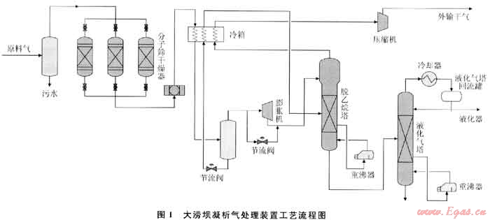 離開(kāi)脫乙烷塔頂?shù)臍庀嘟?jīng)過(guò)冷箱回收冷量后,進(jìn)入膨脹/壓縮機(jī)組的同軸壓縮機(jī),增壓后大部分作為干氣進(jìn)入天然氣外輸管道。脫乙烷塔底的液相作為液化氣塔中部的進(jìn)料,液化氣塔頂產(chǎn)品為液化氣,送入到液化氣儲(chǔ)罐;塔底產(chǎn)品為輕油。
