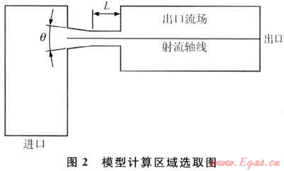 運(yùn)用Fluent對(duì)9組選定的圓錐收斂型噴嘴進(jìn)行數(shù)值模擬實(shí)驗(yàn),得出噴嘴性能隨內(nèi)部結(jié)構(gòu)變化趨勢(shì),然后在性能較優(yōu)的噴嘴附近再選擇16組噴嘴進(jìn)行數(shù)值模擬。模型計(jì)算區(qū)域選取見圖2。網(wǎng)格劃分:由于模鴦?dòng)?jì)算區(qū)域不大,為了加快網(wǎng)格劃分速度,采用一次性劃分網(wǎng)格,全部采用四邊形網(wǎng)格,共劃分48225個(gè)網(wǎng)格。