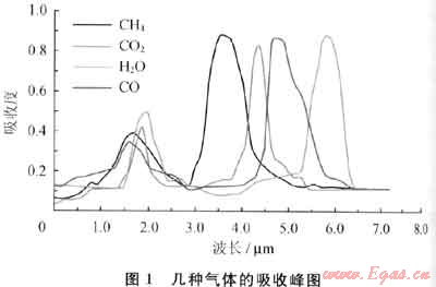 每種氣體都有自己的特征紅外吸收頻率,不受其他氣體吸收峰的干擾,吸收的能量與氣體在紅外光區(qū)內(nèi)的濃度有關(guān),大部分光學(xué)甲烷檢測(cè)儀就是據(jù)此來進(jìn)行設(shè)計(jì)的[10]。甲烷(CH4)分子的光譜吸收區(qū)為3.26μm,在3.26μm附近,C0、C02和H2O分子等沒有明顯吸收,對(duì)甲烷氣體檢測(cè)的影響幾乎可以忽略。由lambert-beer定律可知,當(dāng)一定頻率強(qiáng)度為I0的入射紅外光穿過氣體時(shí),氣體吸收自己特征頻率紅外光的能量后,而使出射光能量減弱為I,即吸收度I=I0exp(-μCL),其中μ為氣體吸收系數(shù);C為待測(cè)氣體濃度;L為光程長(zhǎng)度。CH4、C02、C0和H2O的吸收峰圖如圖1所示。
