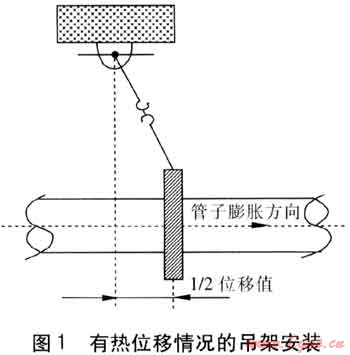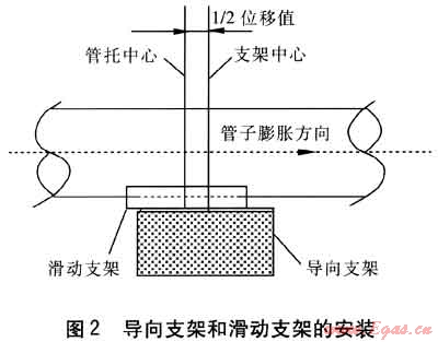 ⑥ 管道波紋管補償器在安裝前要按照使用說明進行預拉伸,安裝方向要與氣流流動方向一致且水平安裝。安裝波紋管補償器時,應設(shè)臨時約束裝置,待管道安裝固定后再拆除臨時約束裝置。管道安裝時,應及時固定和調(diào)整支、吊架。支、吊架位置應準確,安裝應平整牢固,與管道接觸應緊密。有熱位移的管道,吊點應設(shè)在位移的相反方向,按位移值的1/2偏位安裝(見圖1)。固定支架應按設(shè)計文件要求安裝,并應在補償器預拉伸之前固定。導向支架或滑動支架的滑動面應潔凈平整,不得有歪斜和卡澀現(xiàn)象。導向支架和滑動支架的安裝位置應從支承面中心向位移反方向偏移,偏移量應為位移值的1/2(見圖2)。