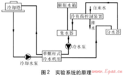 實驗系統(tǒng)的原理見圖2。制冷機(jī)房中設(shè)置單螺桿式冷水機(jī)組、冷水泵和冷卻水泵各1臺,以及分水器和集水器。冷卻水經(jīng)冷卻水泵加壓后進(jìn)入冷水機(jī)組,吸收熱量后被送至屋頂?shù)睦鋮s塔,經(jīng)冷卻降溫后又返回冷水機(jī)組,完成循環(huán)。冷水則是經(jīng)過冷水泵加壓后進(jìn)入冷水機(jī)組,被冷卻降溫后進(jìn)入分水器,之后進(jìn)入冷負(fù)荷控制裝置中,與自來水混合后進(jìn)入集水器,再被加壓送入冷水機(jī)組,完成循環(huán)。