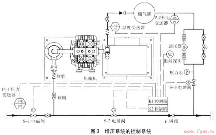 北方地區(qū)一家工業(yè)用戶,生產(chǎn)工藝過(guò)程有一道工序需要燃?xì)鈮毫?.10~0.12MPa,用氣量為30m3/h,但是管網(wǎng)供應(yīng)壓力范圍為0.08~0.12MPa,大部分時(shí)間穩(wěn)定在0.10MPa,一旦供氣壓力低于0.10MPa,生產(chǎn)就面臨停產(chǎn)。用戶經(jīng)過(guò)討論后對(duì)增壓系統(tǒng)提出以下要求:當(dāng)管網(wǎng)供應(yīng)的天然氣壓力在0.10MPa以上時(shí)直接使用管網(wǎng)供氣,增壓系統(tǒng)不工作;當(dāng)管網(wǎng)供應(yīng)的天然氣壓力在0.10MPa以下時(shí)靠增壓系統(tǒng)供氣,當(dāng)一臺(tái)壓縮機(jī)長(zhǎng)時(shí)間工作后,出口溫度高于70℃時(shí)自動(dòng)切換到另外一臺(tái)壓縮機(jī)工作。