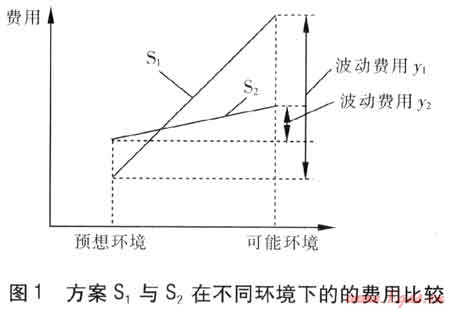 圖1中,波動費(fèi)用是指當(dāng)預(yù)想環(huán)境變化至可能環(huán)境后,方案S1、S2為了適應(yīng)變化而增加的費(fèi)用。可見雖然在預(yù)想環(huán)境下S1比S2投資費(fèi)用省,但當(dāng)未來環(huán)境發(fā)生變化后,S1比S2付出了更多的追加費(fèi)用(y1-y2),因此S2比S1具有更好的靈活性與適應(yīng)性。柔性規(guī)劃的意義在于通過在規(guī)劃前期增加少量資金投入,使系統(tǒng)能夠更加適應(yīng)未來可能的變化,即無論未來環(huán)境如何變化,柔性規(guī)劃方案都能以較少的追加投入來適應(yīng)這種變化。采用柔性規(guī)劃方法總體上可以節(jié)省大量的資金和物資。