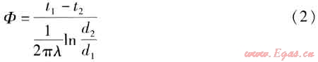 蒸汽輸送過程中,單位長度管道的熱損失可根據(jù)圓筒體的導(dǎo)熱微分方程[4]計(jì)算得到。忽略蒸汽和管壁的熱阻,可得下式: