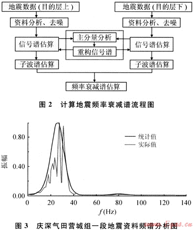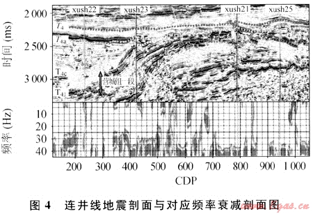 頻率衰減是指地震波在地下巖層中傳播時總能量的損失,包括波前發(fā)散引起的振幅衰減和地層非完全彈性引起的地震波振幅的吸收衰減,屬于介質(zhì)內(nèi)在的屬性。不同巖層對地震波具有不同的吸收程度,地層的吸收作用越強(qiáng),地震波的高頻成分衰減越快;反之亦然。理論研究表明,在地下巖層中,如果孔隙發(fā)育,充填油、氣、水(尤其對于含氣的情況)時,地震反射吸收系數(shù)增大,高頻成分吸收衰減加劇,含油氣地層吸收系數(shù)比相同巖性不含油氣地層高幾倍甚至超出一個數(shù)量級[7~8]。因此,可以利用經(jīng)過目的層前后地震波的頻率衰減屬性進(jìn)行儲層油氣檢測。