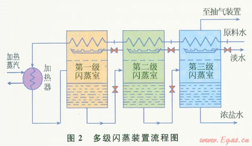 煤層氣產(chǎn)出水蒸餾脫鹽處理裝置的基本原理就是加熱煤層氣產(chǎn)出水,使之產(chǎn)生大量蒸汽并進(jìn)行氣液分離。同時(shí),利用原料水為分離出的蒸汽進(jìn)行冷卻。