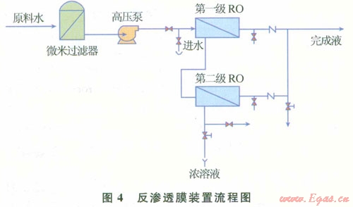反滲透脫鹽裝置主要由過濾設(shè)備、加壓泵和反滲透膜裝置(中空纖維式或卷式的膜分離設(shè)備)組成。反滲透膜裝置流程如圖4所示。反滲透膜能截留水中的各種無機(jī)離子、膠體物質(zhì)和大分子溶質(zhì),從而取得凈化的水。反滲透膜的材料和規(guī)模根據(jù)煤層氣產(chǎn)出水水質(zhì)、運(yùn)輸方式和預(yù)處理方式的差異而有所不同。為了提高反滲透膜的脫鹽效率和使用壽命,必須對(duì)原料水進(jìn)行過濾等預(yù)處理。反滲透膜脫鹽率高,受pH值、溫度等因素影響較小,制膜原料來源廣、加工簡(jiǎn)便、成本低廉,在澳大利亞煤層氣工業(yè)中有著廣泛的應(yīng)用。其缺點(diǎn)在于對(duì)采出水的水質(zhì)要求較高,預(yù)處理過程復(fù)雜[3-4]。