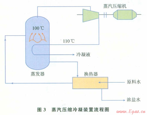 蒸汽壓縮冷凝脫鹽技術(shù)是將鹽水預(yù)熱后,引入蒸發(fā)器并使之在蒸發(fā)器內(nèi)部分蒸發(fā)。蒸汽壓縮冷凝裝置流程如圖3所示,流程所產(chǎn)生的二次蒸汽經(jīng)壓縮機(jī)壓縮提高壓力后引入到蒸發(fā)器的加熱側(cè),蒸汽冷凝后作為完成液引出,如此實(shí)現(xiàn)熱能的循環(huán)利用。蒸汽壓縮冷凝方法可使冷卻水中的有害成分得到濃縮排放,并使冷凝液作為循環(huán)水和鍋爐補(bǔ)充水返回系統(tǒng),同時(shí)將低能量的蒸汽轉(zhuǎn)化為高能量的蒸汽用于后面裝置的加熱。單個(gè)蒸汽壓縮裝置的處理能力為250~3 000m3/d。