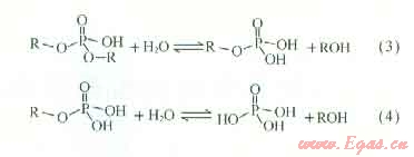 有機(jī)酯的水解反應(yīng)為?;忌系挠H核取代,羧酸酯水解反應(yīng)方程式為式(1)[11],產(chǎn)物為羧酸和飽和醇;磷酸酯水解反應(yīng)方程式為式(2)~(4),產(chǎn)物為磷酸和飽和醇??梢姡袡C(jī)酯水解后產(chǎn)物為有機(jī)酸和醇類物質(zhì)。由于有機(jī)酸為酸化常用體系,有助于酸化,同時(shí)醇類物質(zhì)具有較好的潤濕延展性,能降低表面張力。因此,有機(jī)酯不僅不會(huì)對(duì)儲(chǔ)層造成傷害,其水解產(chǎn)物有機(jī)酸還能起到一定的酸化效果,醇類還能解除水鎖現(xiàn)象。